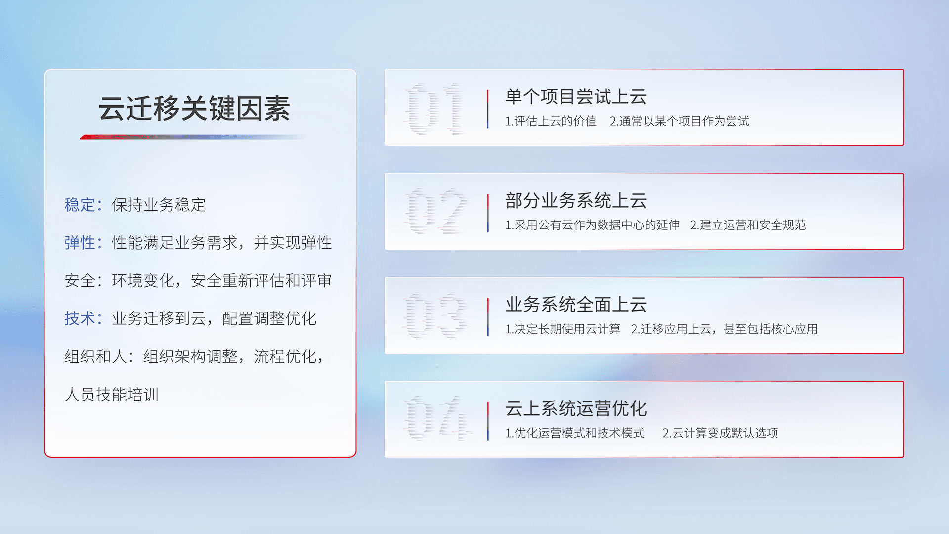 结合实际业务,,,从规划设计、、云平台选型、、云原生改造、、、数据迁移、、集成交付,,迁移全过程为客户识别最佳上云路径,,,做好风险识别管理,,,设计网络架构、、身份权限、、、安全审计合规、、、、操作审计、、、、日志审计、、、、监控告警策略、、、、多站点容灾设计等,,对云上基础设施进行整体规划,,提升IT治理水平,,,以满足弹性、、、高可用、、高性能的需求。。。。