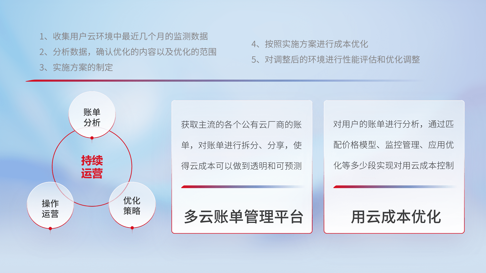 通过多云纳管,,以统一的资源数据模型把客户的云资源进行抽象和封装,,,进而实现对多云资源的统一操作,,,,保障云资源管理的可靠性、、、稳定性与可用性。。。量身定制化运维内容,,,配置、、开发运维、、、补丁管理、、备份、、、、监控、、、、认证和访问管理、、、审计和日常巡检等,,,,保障在用云过程中的可靠度,,,,稳定度以及高可用率。。